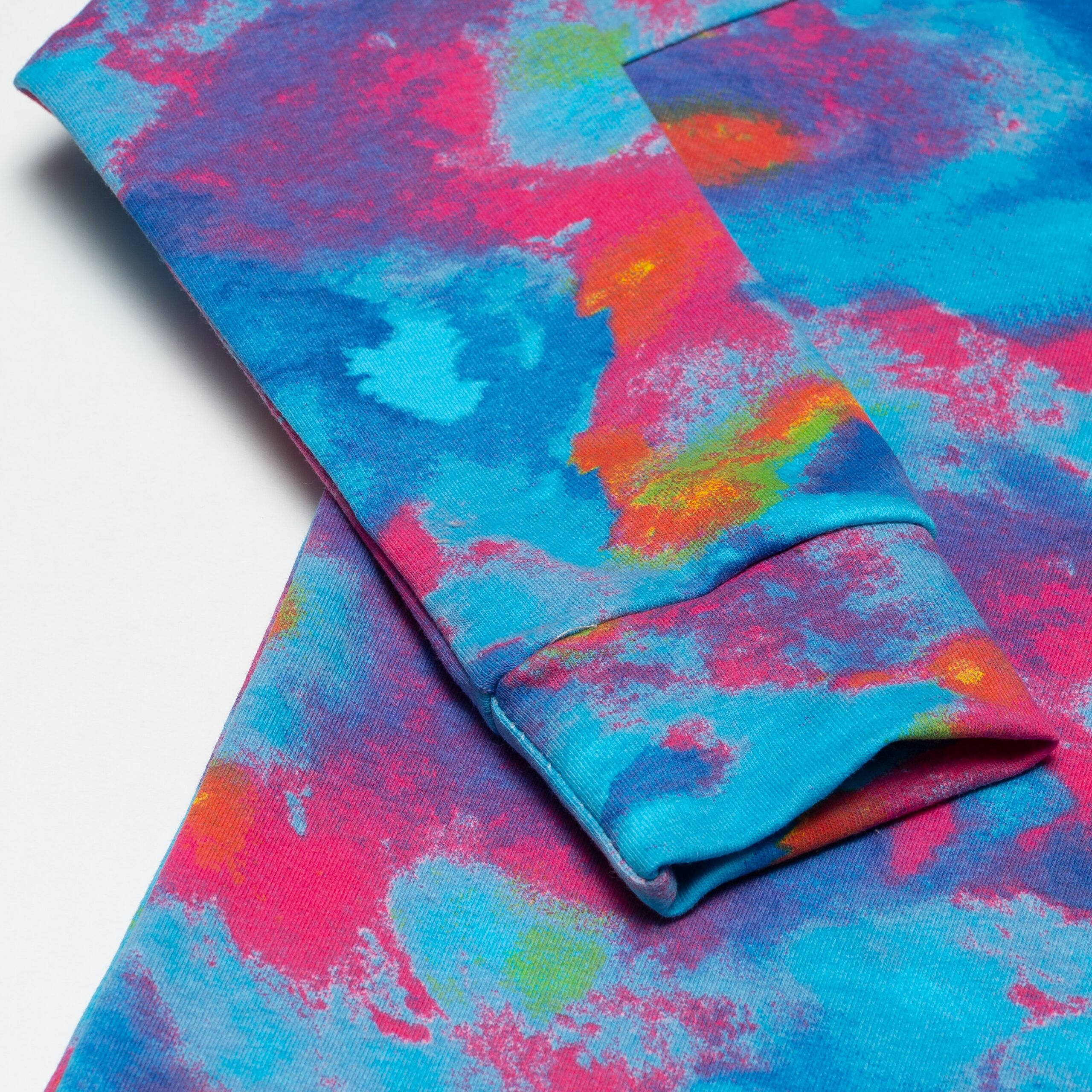 Bluza z kapturem wykonana z dzianiny dresowej w składzie 95% bawełna 5% elastan.Rękawy wykończone mankietem z tej samej dzianiny ,a dół bluzy na prosto. Po bokach ozdobne rozcięcia.