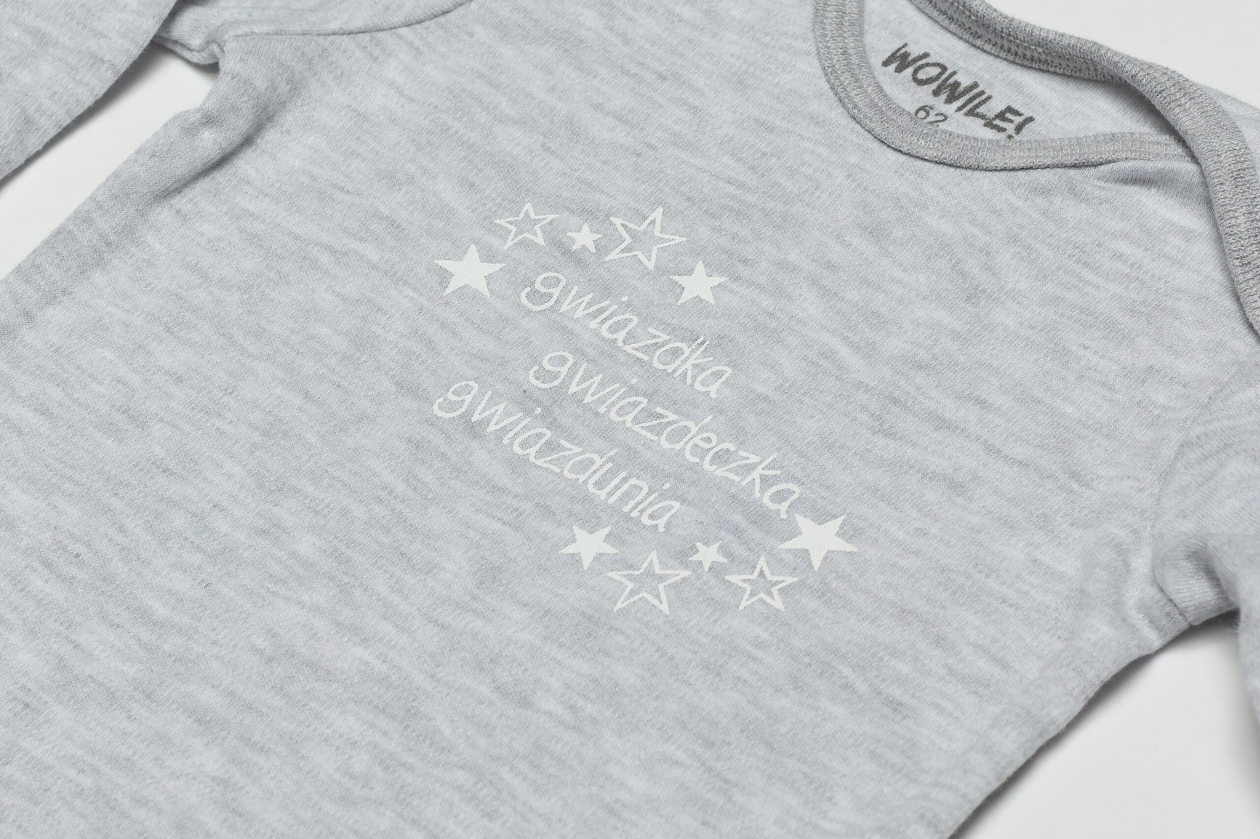 Body wykonane z 100% bawełny ozdobionej sitodrukiem.W kroku zapinane na bezniklowe napki.Dostępne w kolorze białym rózowym i szarym.Uwaga w rozmiarze 56 dodatkowo w rękawie niedrapki chroniace dziecko przed podrażnieniem skóry twarzy.