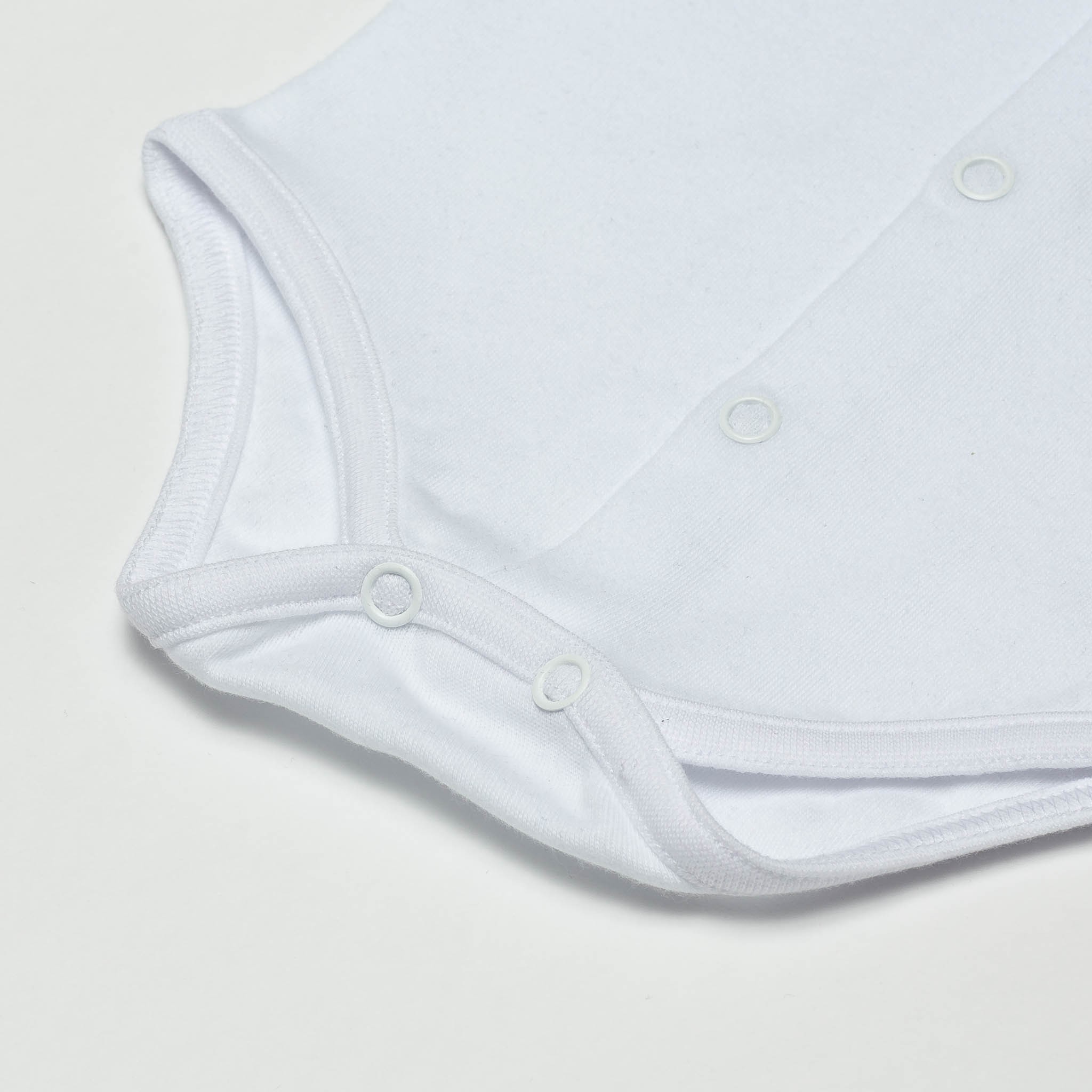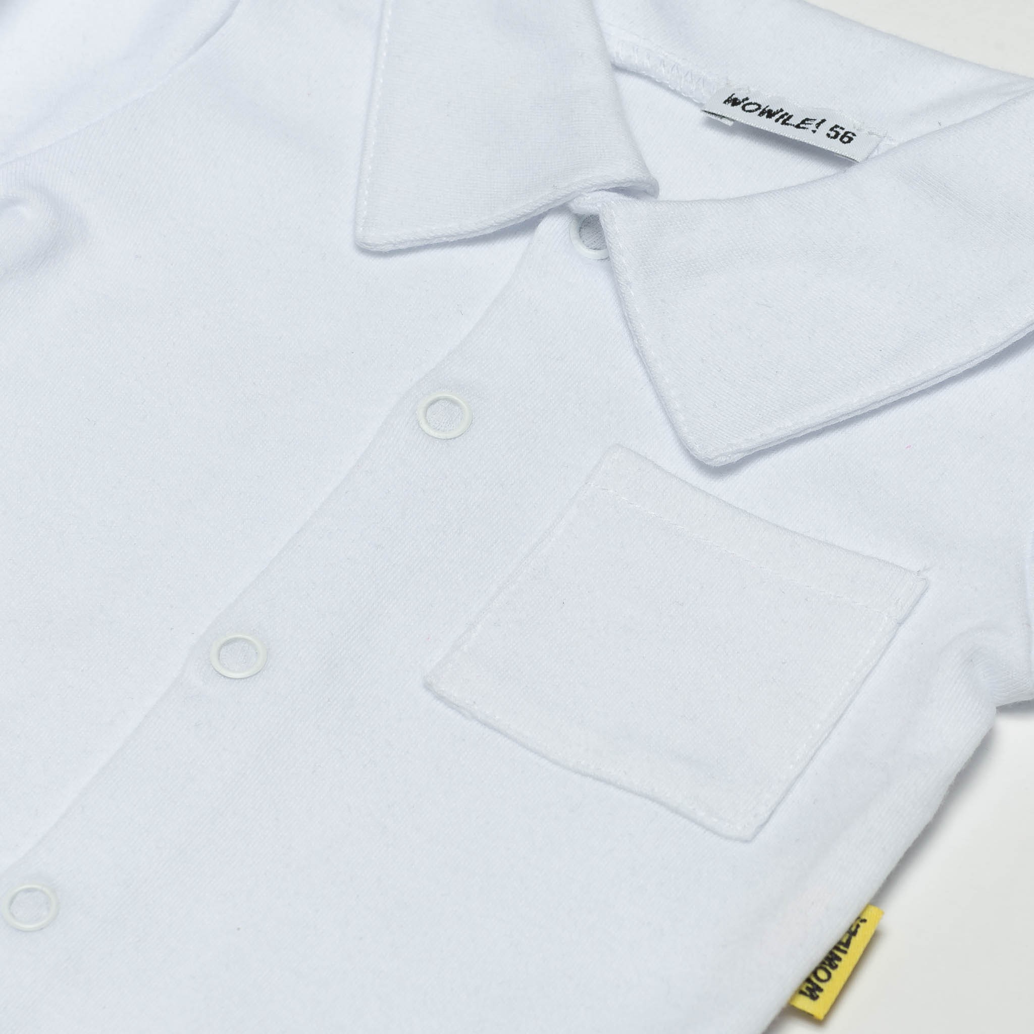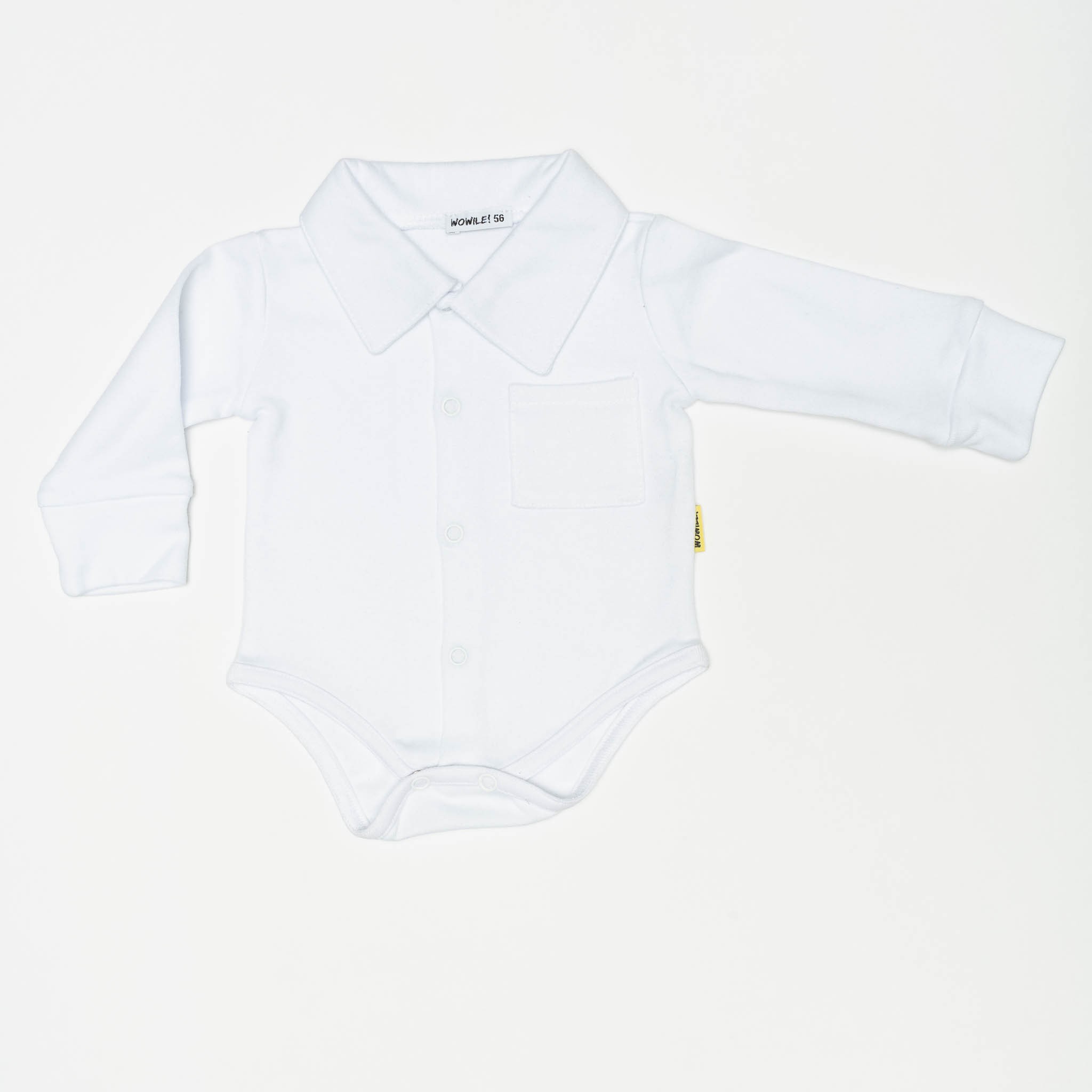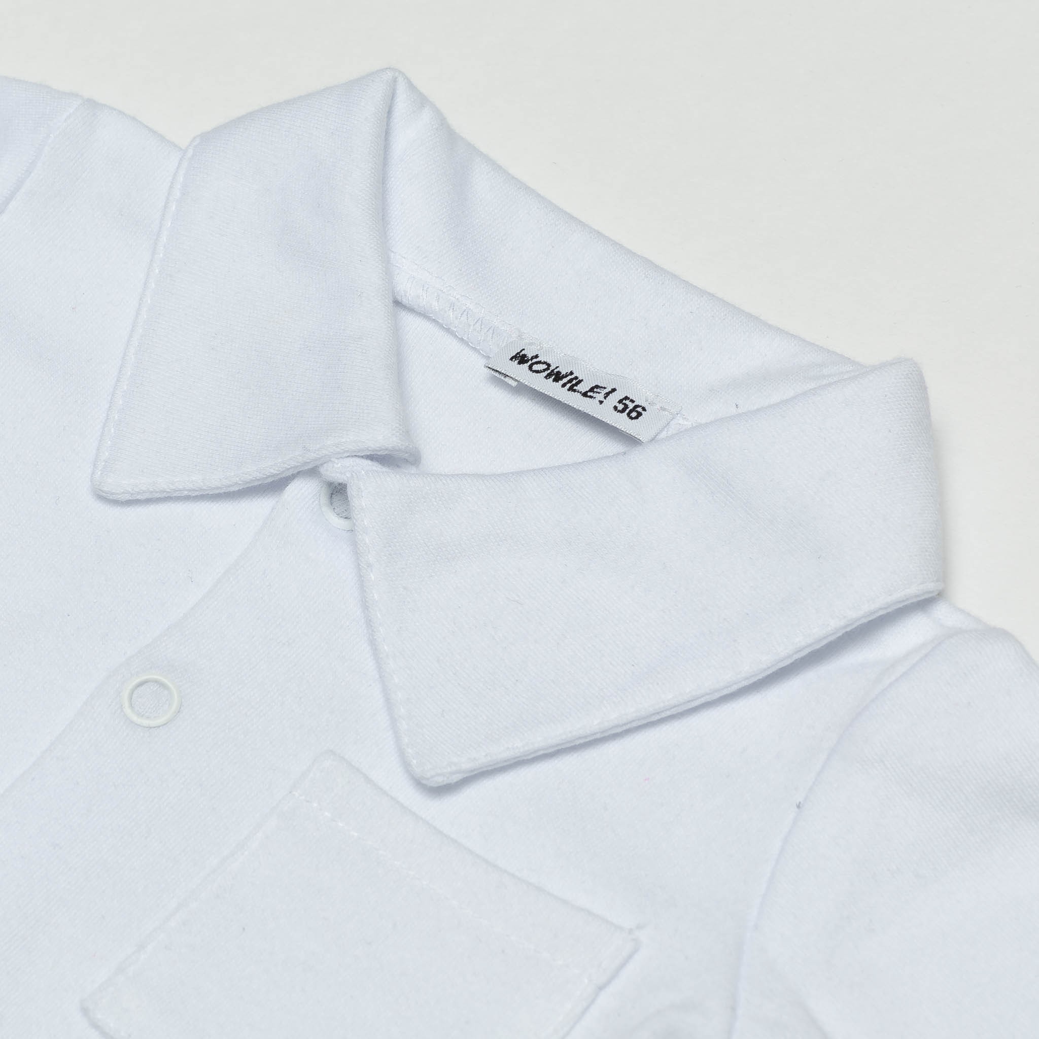 Body koszulowe kolor biały zapinane na bezniklowe napki z przodu oraz w kroku.Klasyczny kołnierzyk. Na lewym boku ozdobna kieszonka. Rękawy wykończone mankietem. Polska bawełna 100%