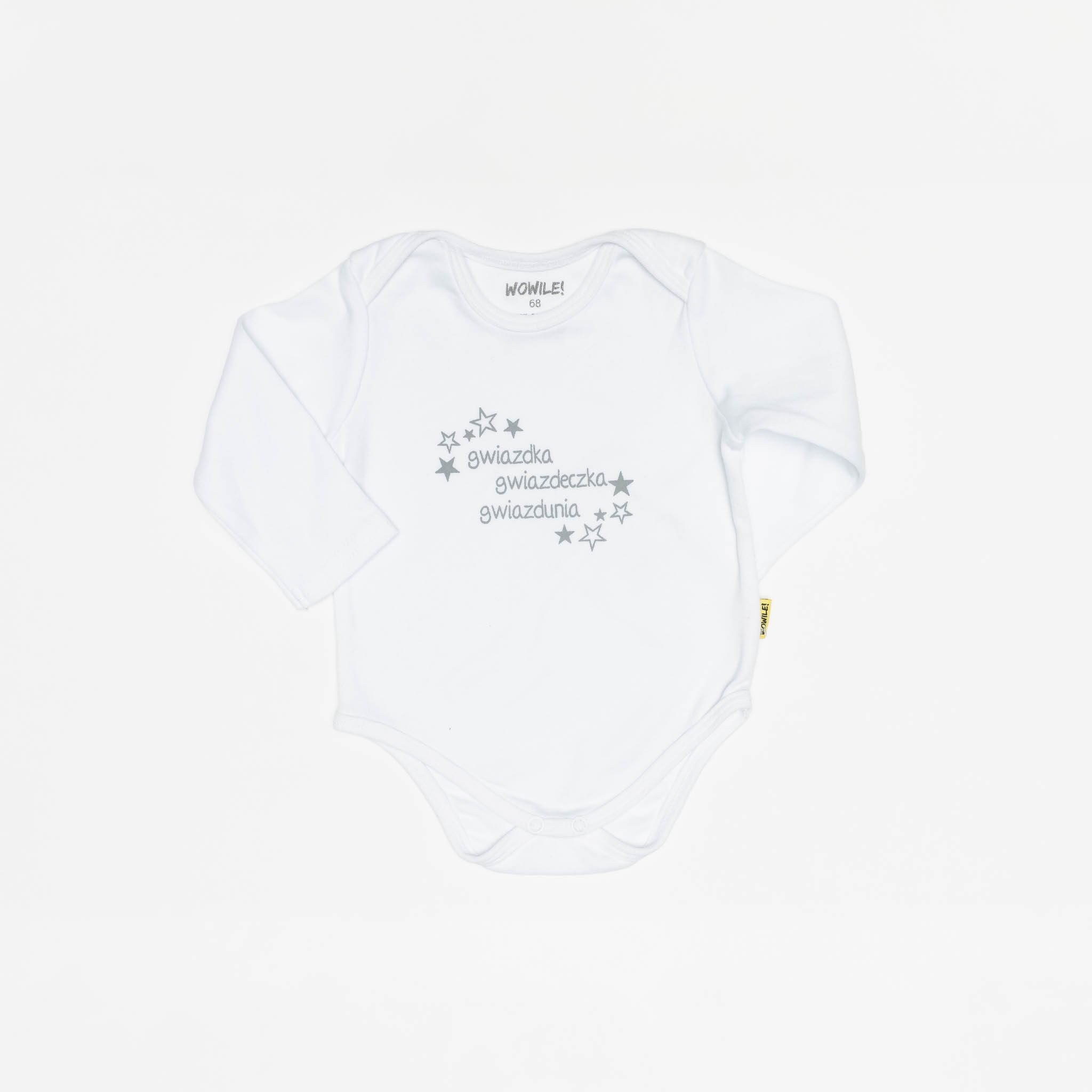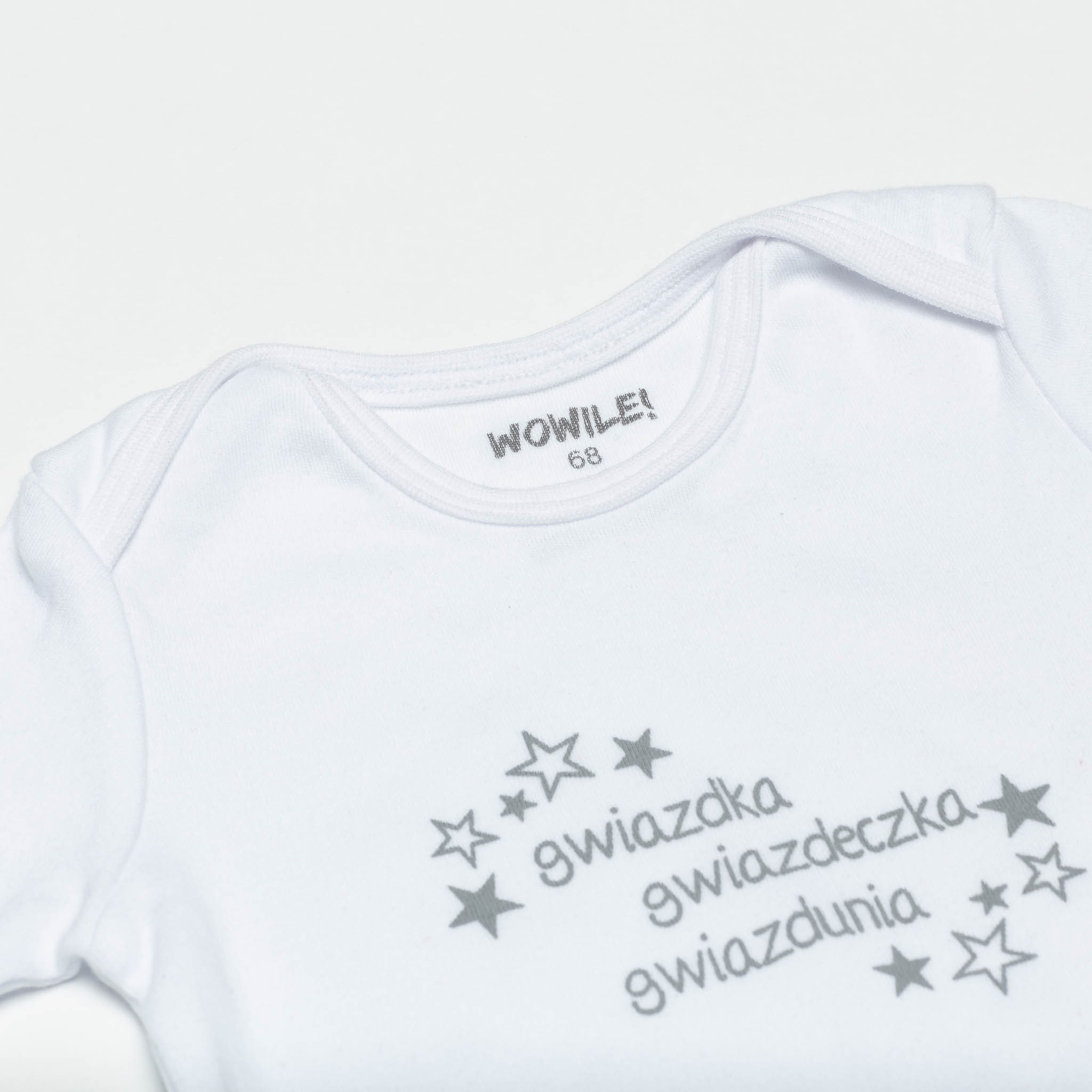 Body wykonane z 100% bawełny ozdobionej sitodrukiem.W kroku zapinane na bezniklowe napki.Dostępne w kolorze białym rózowym i szarym.Uwaga w rozmiarze 56 dodatkowo w rękawie niedrapki chroniace dziecko przed podrażnieniem skóry twarzy.