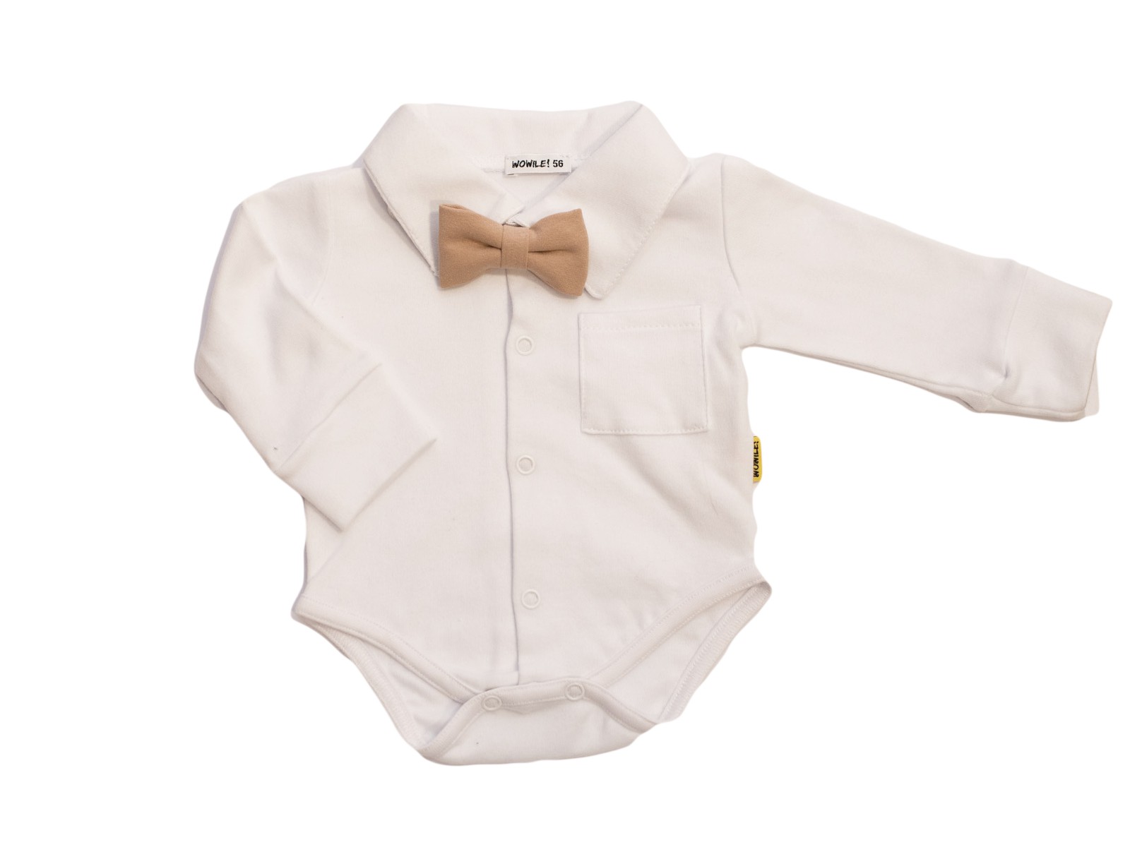 W skład zestawu wchodzi również koszulo body z fantazyjną muszką w takim samym kolorze co garnitur .