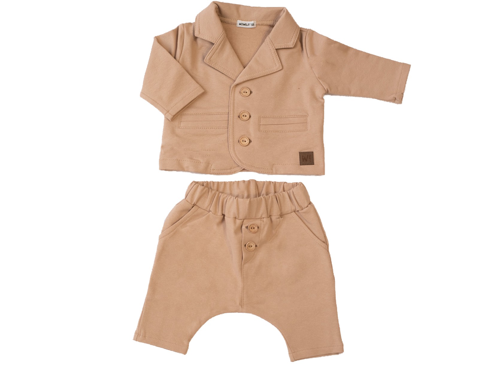 Garniturek wykonany z dzianiny dresowej w składzie 95% bawełna 5% elastan. Marynarka zapinana na trzy eco guziczki. Po bokach imitacja kieszonek .