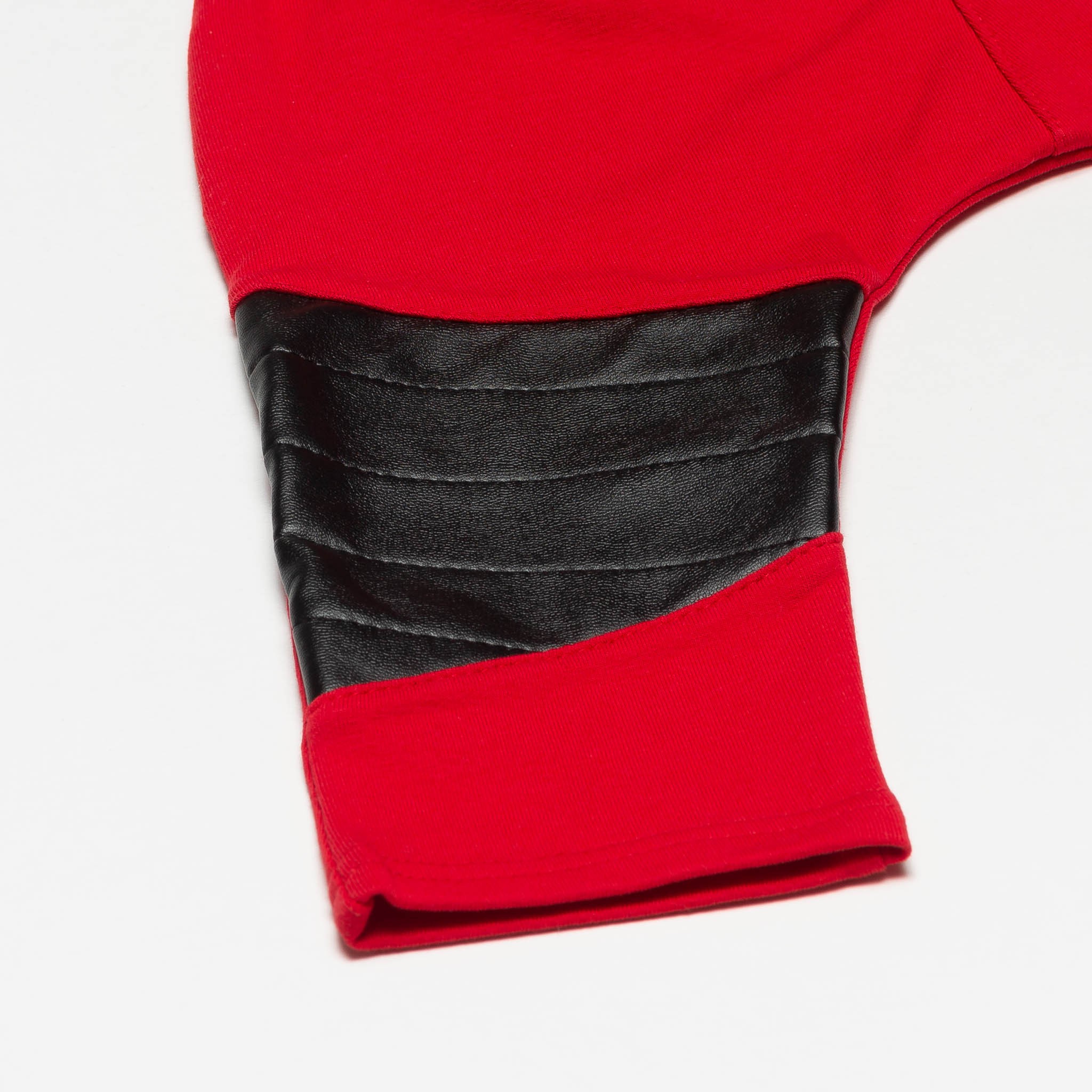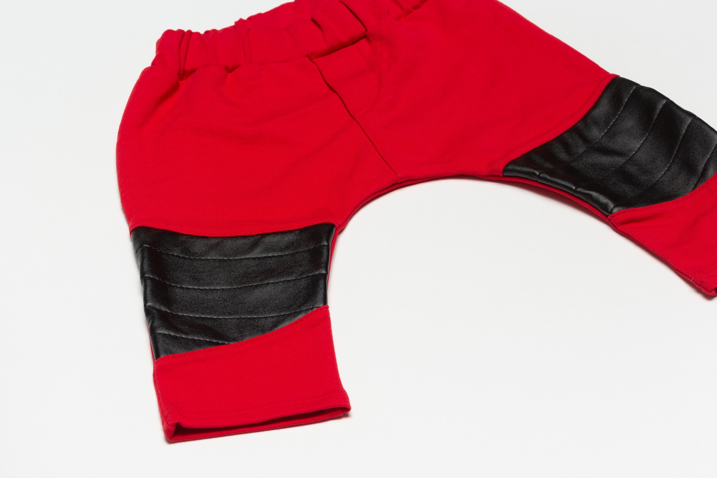 Spodnie wykonane z dzianiny dresowej w składzie 95% bawełna i 5 % elastan .Na kolanach ozdobne łaty z ecoskóry wzmocnione przeszyciami.